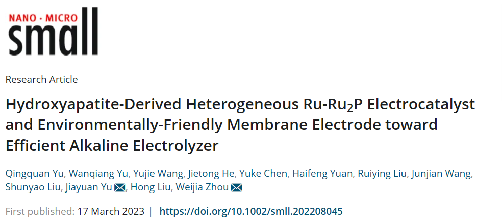 济南大学的周伟家教授团队,在国际知名期刊Small上发表题为“Hydroxyapatite-Derived Heterogeneous Ru-Ru2P Electrocatalyst and Environmentally-Friendly Membrane Electrode toward Efficient Alkaline Electrolyzer”的文章。该文章报道了一种高效Ru-Ru2P异质结电催化剂,并基于此开发了新型隔膜,进一步构建了膜电极电解槽用于高效全解水。