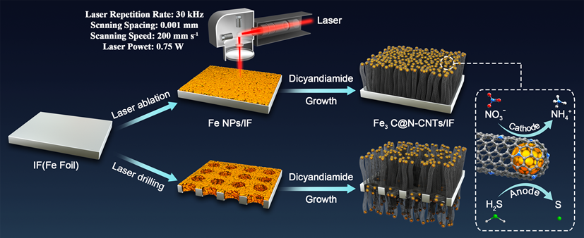 济南大学的周伟家教授团队在国际知名期刊Applied catalysis B: Environmental上发表题为“Electrocatalytic Upcycling of Nitrate and Hydrogen Sulfide Via a Nitrogen-doped Carbon Nanotubes Encapsulated Iron Carbide Electrode”的研究论文。该工作利用激光粗化处理过的铁片作为前驱体成功制备了氮掺杂碳纳米管包裹碳化铁(Fe3C@N-CNTs/IF)作为电催化剂,可以同时实现硝酸根电化学还原制氨以及硫化氢的电化学氧化制硫。