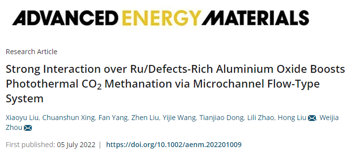 刘宏、周伟家教授团队在国际知名期刊Advanced Energy Materials上发表题为“Strong Interaction over Ru/Defects-Rich Aluminium Oxide Boosts Photothermal CO2 Methanation via Microchannel Flow-Type System”的研究论文。在这项工作中,利用紫外脉冲激光两步法直接在铝箔上可控地构建超小Ru纳米颗粒负载在富含缺陷氧化铝催化剂(Ru-Al2O3-x-L)。紫外脉冲激光制备的柳絮绒毛状的Al2O3-x-L利用独特的微纳结构和富含缺陷性质进行高效捕获太阳光并且转化为热。同时,由于Al2O3-x-L中的缺陷有效地锚定了Ru金属,结合紫外脉冲激光超快的加工速度,Ru纳米颗粒形核生长时间短,从而得到的超小的Ru纳米粒子(2.87 nm),并且超小Ru纳米粒子和Al2O3-x-L之间表现出强金属-基体相互作用(SMSI)。得益于SMSI效应,Ru-Al2O3-x-L催化剂在低温常压(236.4 ℃,101 kPa)下表现出优异的光热CO2催化性能(CH4产率为12.35 mol/gRu/h),密闭体系中催化性能为相同条件下传统Ru-Al2O3粉末催化剂的1.75倍。此外,基于Ru-Al2O3-x-L催化剂的三维结构,创新性的建立了一种微孔道连续流动反应器。借助有限元模拟计算确定微通道边缘的局部压力有利于CO2甲烷化反应,常压下CH4产率进一步提高至14.04 mol/gRu/h。